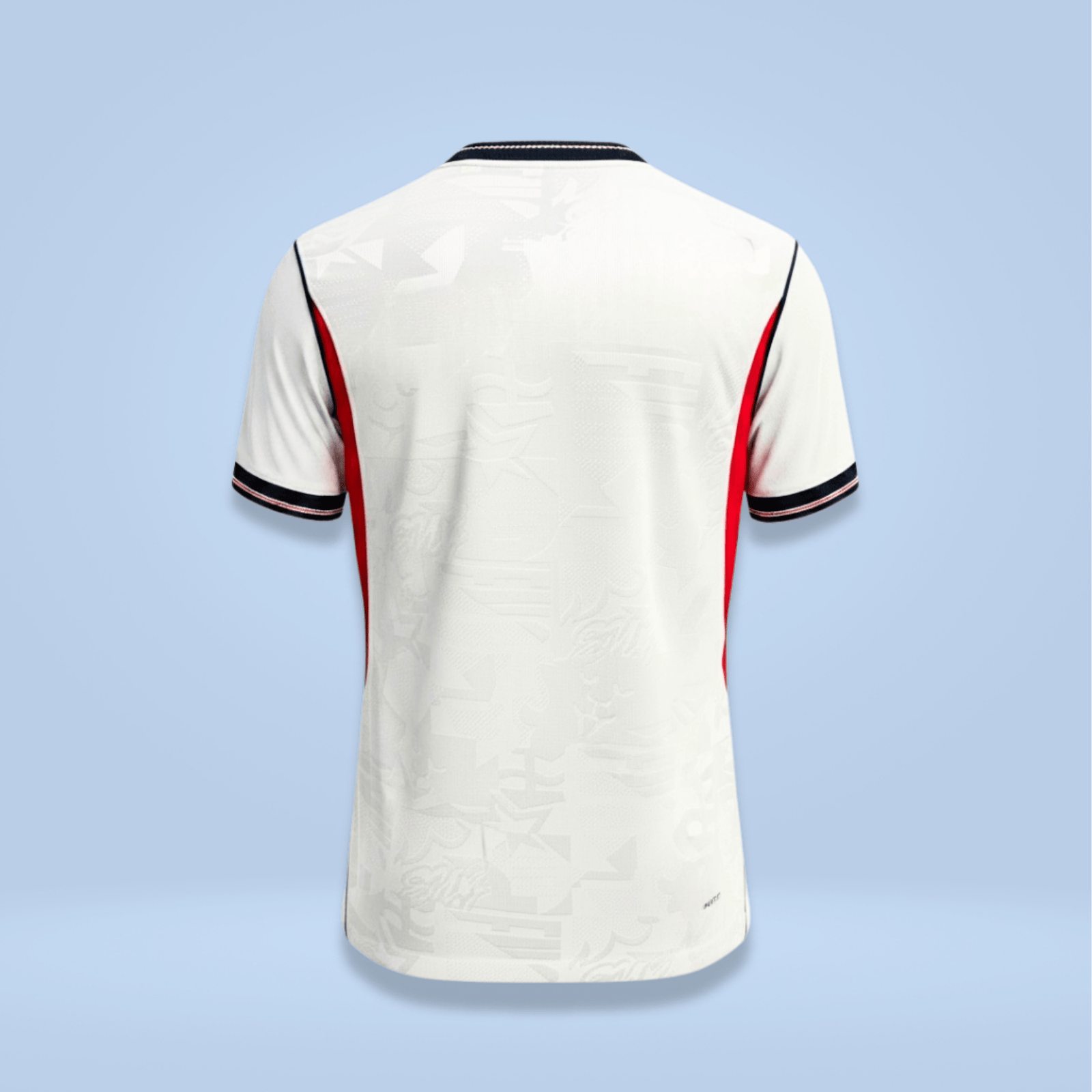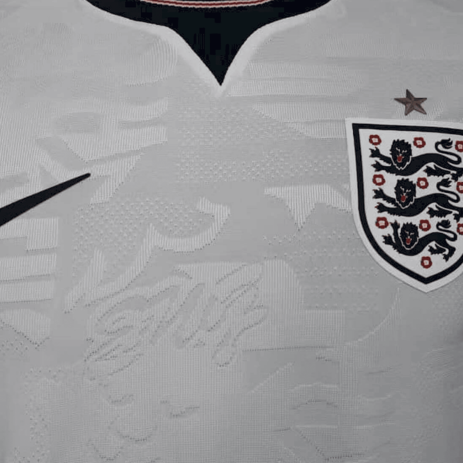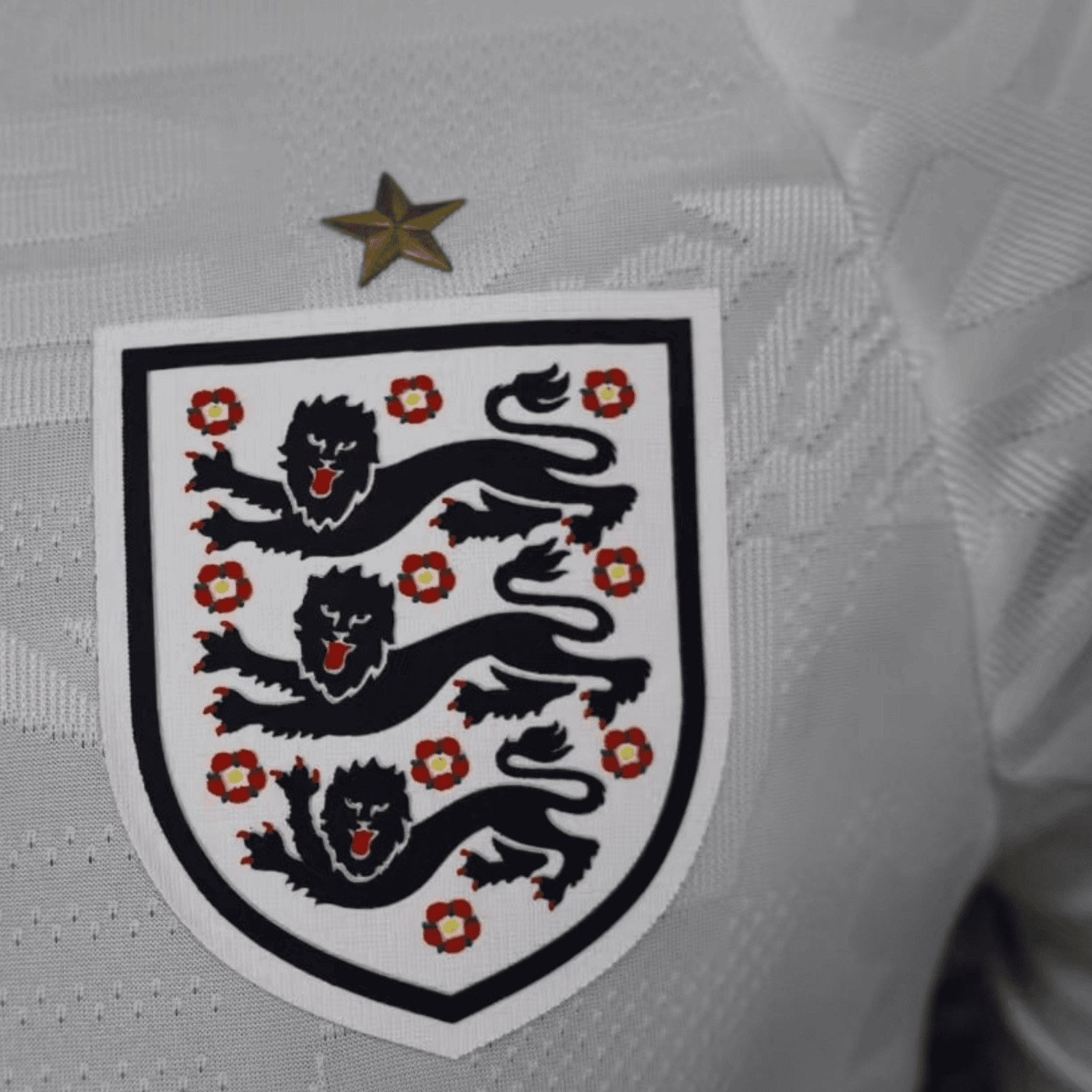 Lead the line in the England World Cup kit 2026 home shirt, player version. A pristine white base, sharp navy detailing, and subtle red flashes create a clean, modern profile that reads Three Lions from every angle. The crest sits proudly at the chest beneath a single gold star, a nod to 1966, while a sculpted V-neck and streamlined shoulders give the jersey a fast, broadcast-ready silhouette.
