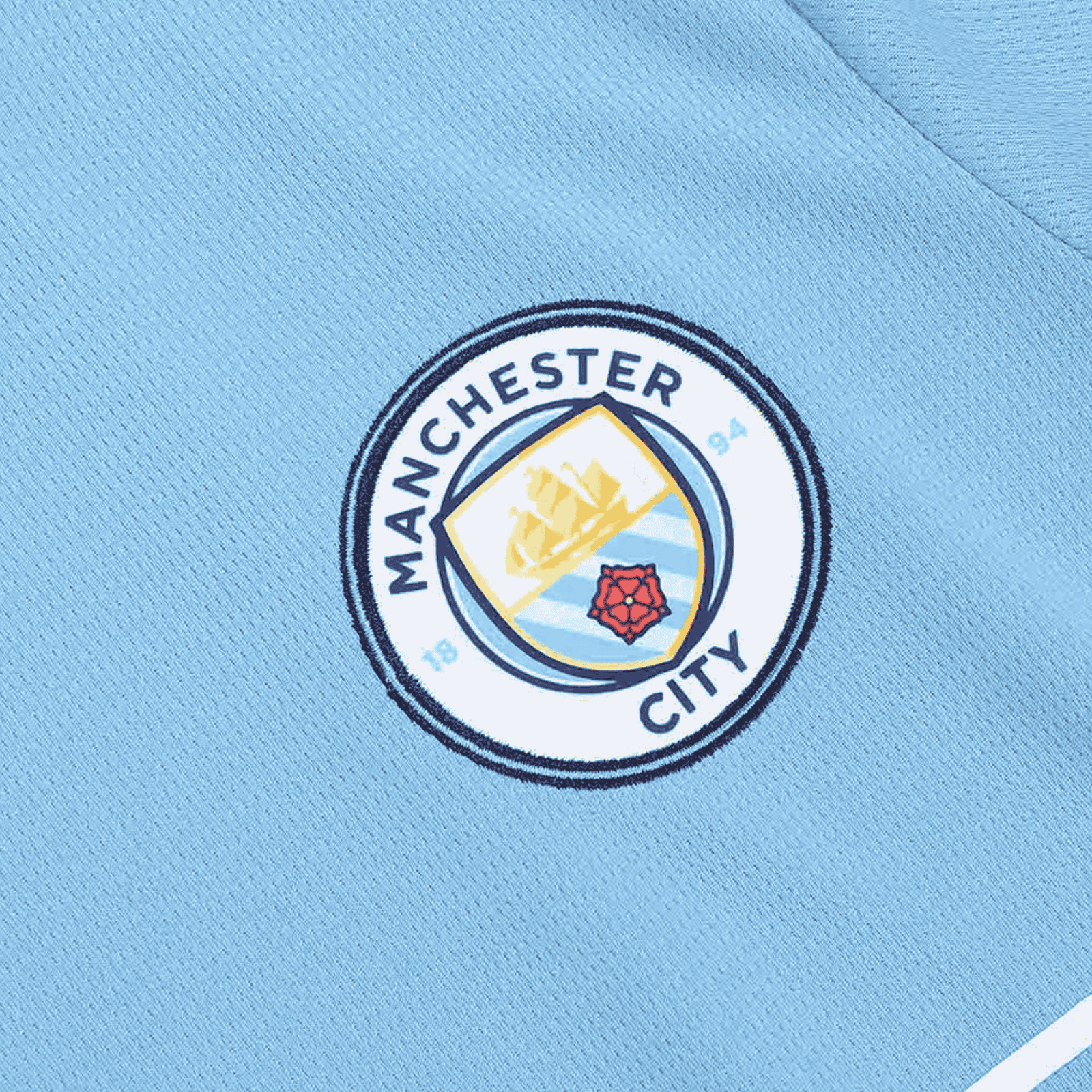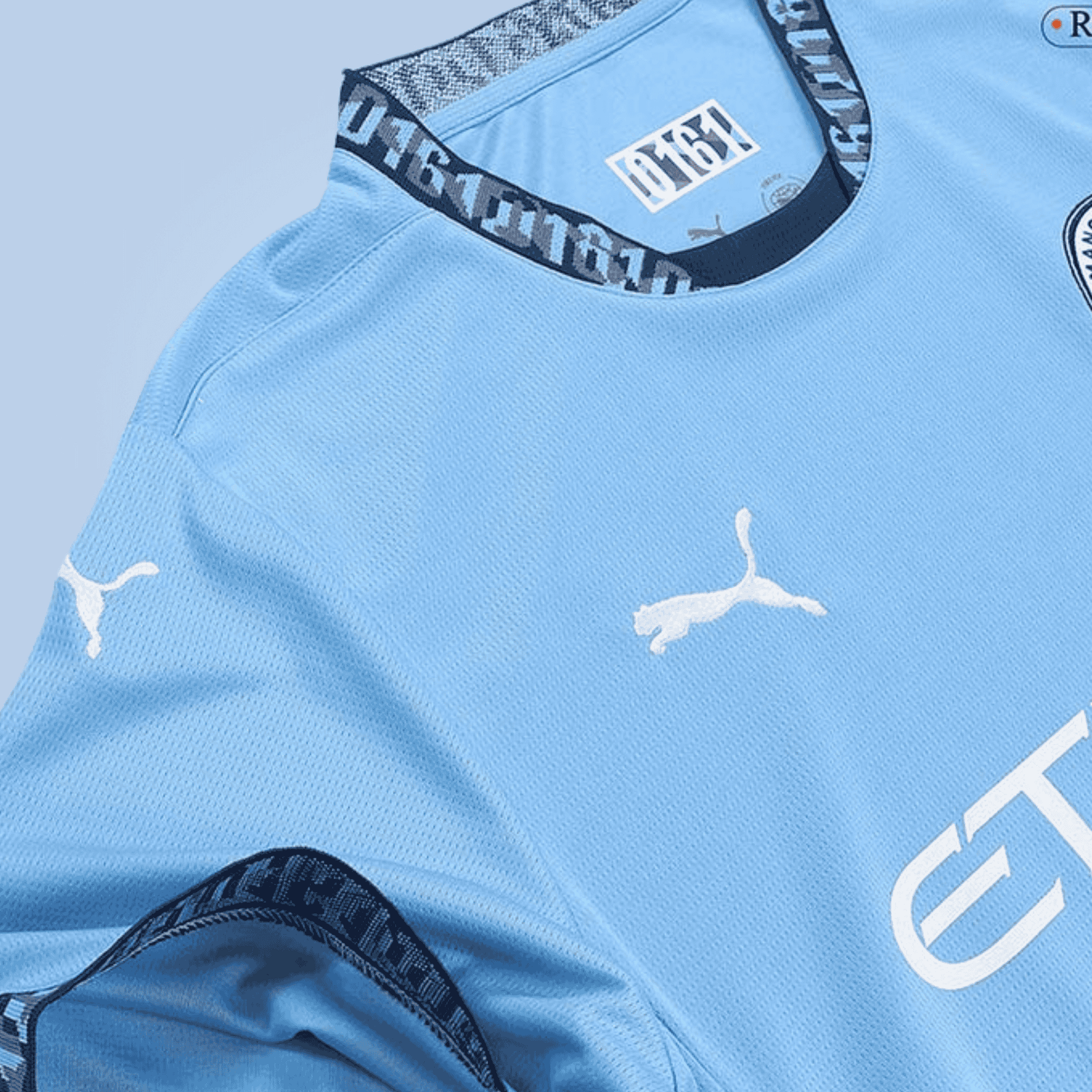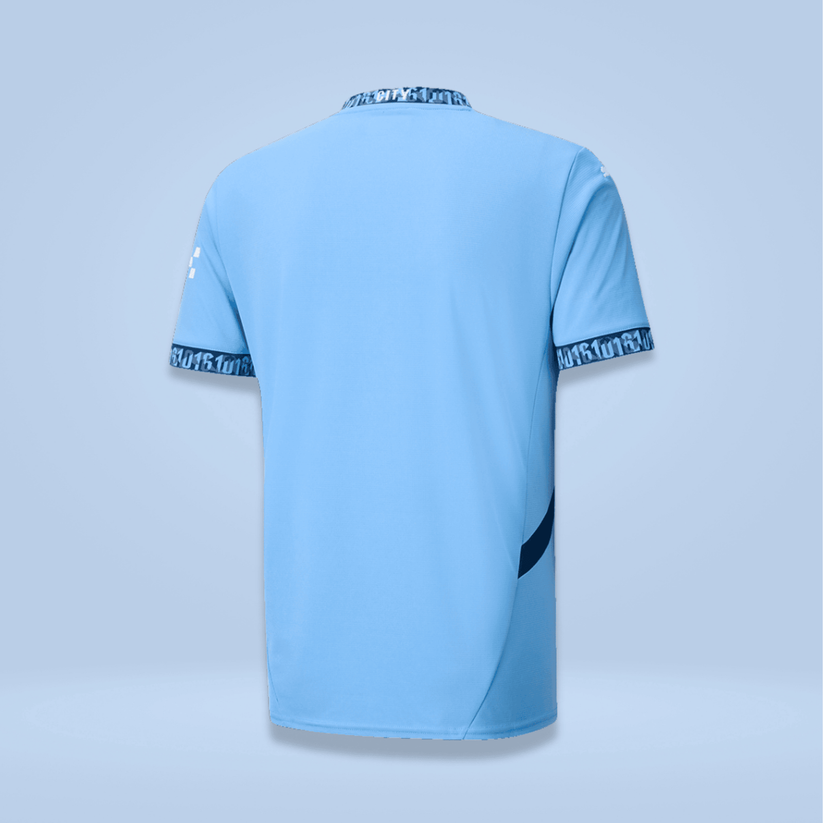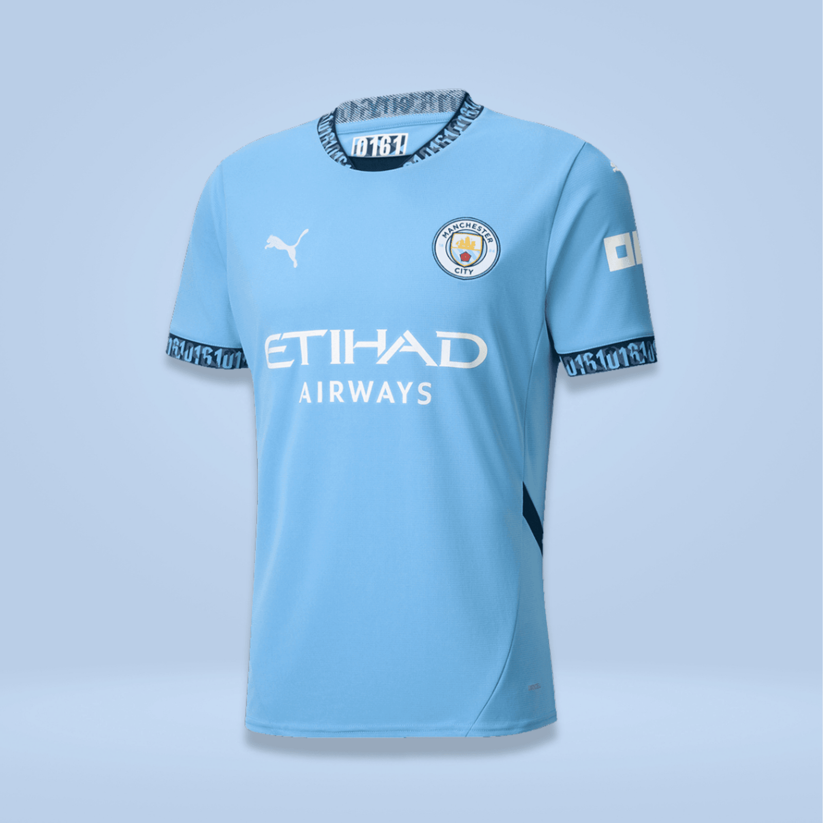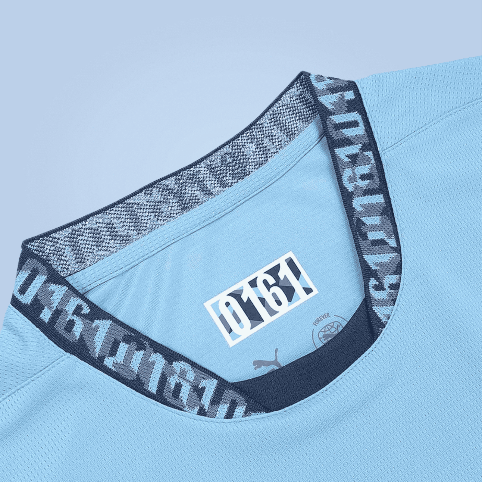This official Manchester City 2024/25 Home jersey is drawing inspiration from Manchester’s 0161 area code because for us it’s a sense of what being Mancunian is all about. You’ll see it written on lampposts, printed on t-shirts, and tattooed on people. You will find it printed inside the neckline and featured in a patterned flat knit rib on the neckline and cuffs. The accents are the OKX print on the left sleeve, the iconic Manchester City crest and PUMA Cat logo embroidered on the chest. Designed for the fans, the home kit jersey pairs the same match-worn look with a casual short-sleeve silhouette and comfortable regular fit, ideal for both game day and everyday wear. If it’s Sky Blue, it’s 0161. That’s Manchester Calling.