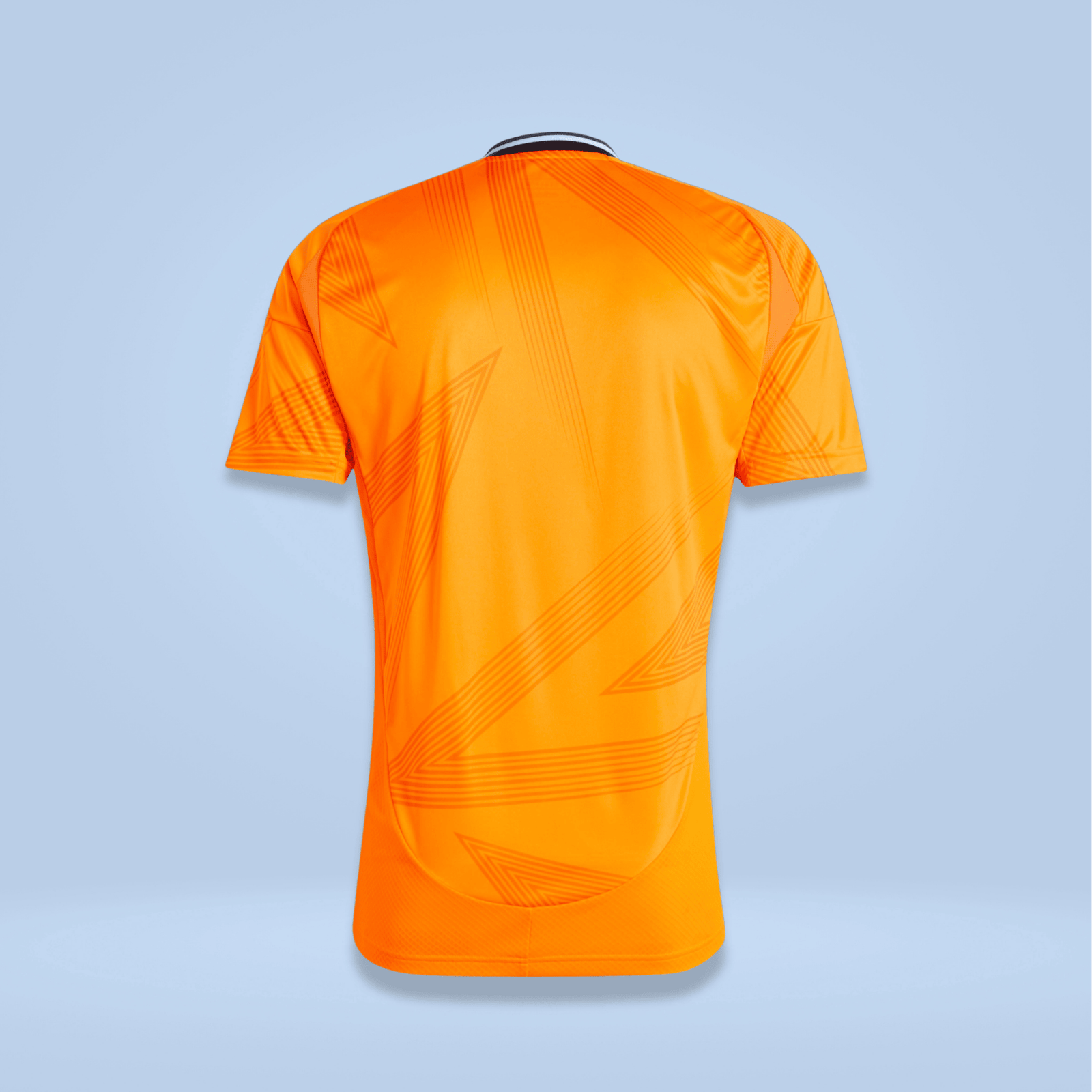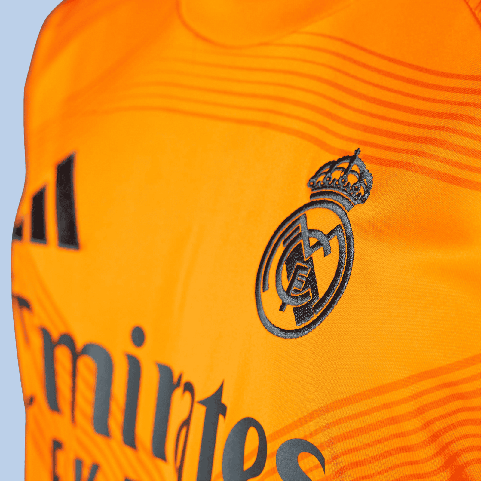 Highlighting the rise of a brand-new football generation. Created to complement Real Madrid’s shimmering skills, this adidas away jersey stands out with a vibrant orange base and an abstract, star-inspired design. Its dark blue details include an embroidered club badge. Behind the scenes, moisture-managing AEROREADY will keep fans on top of their game.This product is made with 100% recycled materials. By reusing materials that have already been created, we help to reduce waste and our reliance on finite resources and reduce the footprint of the products we make.
