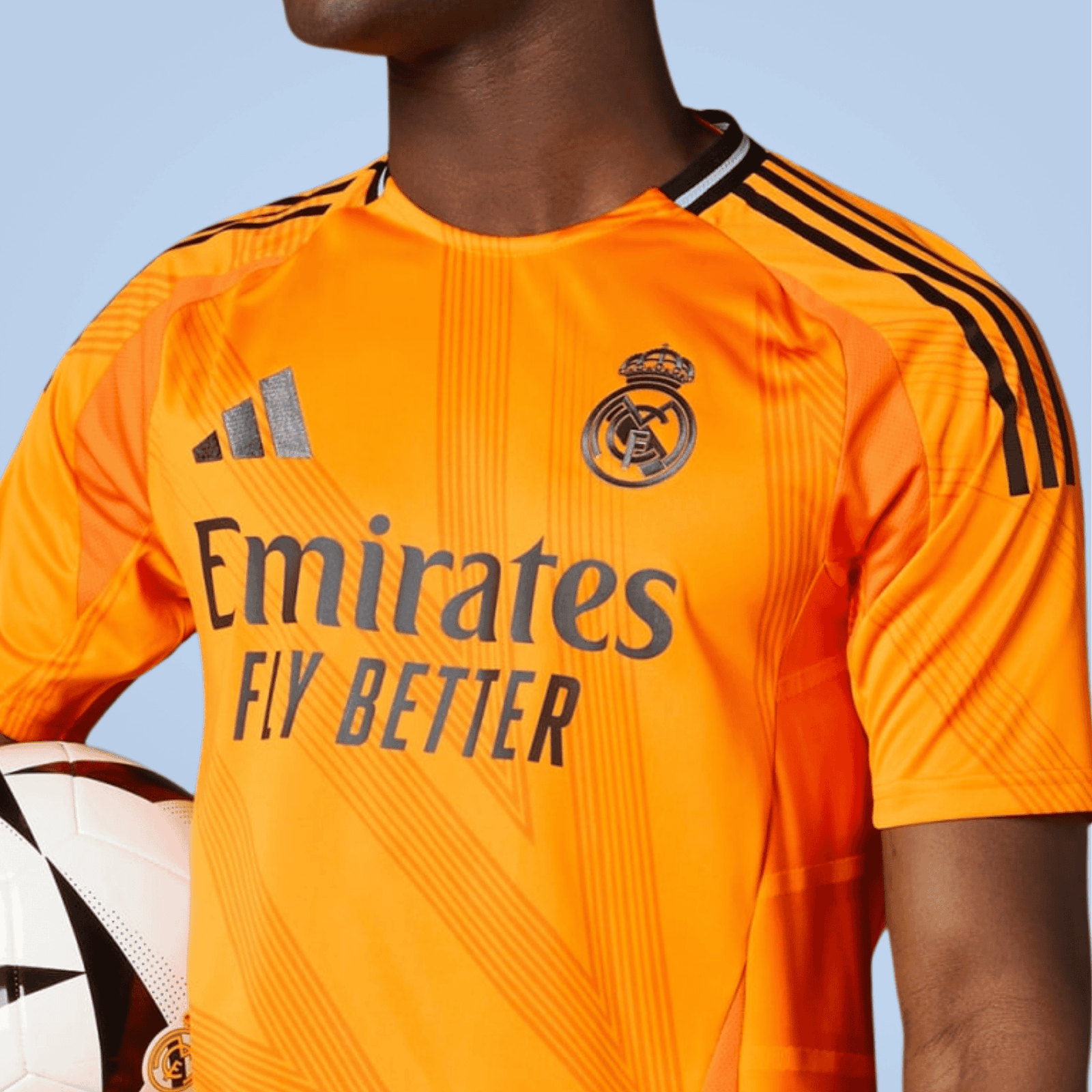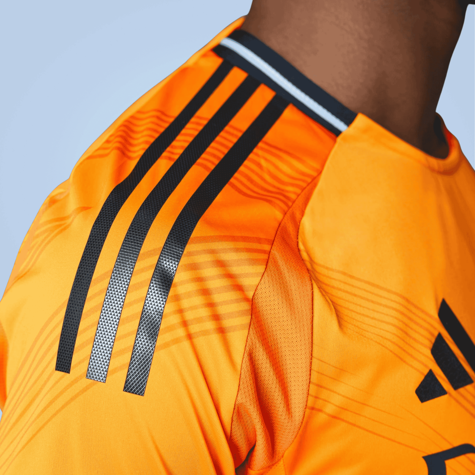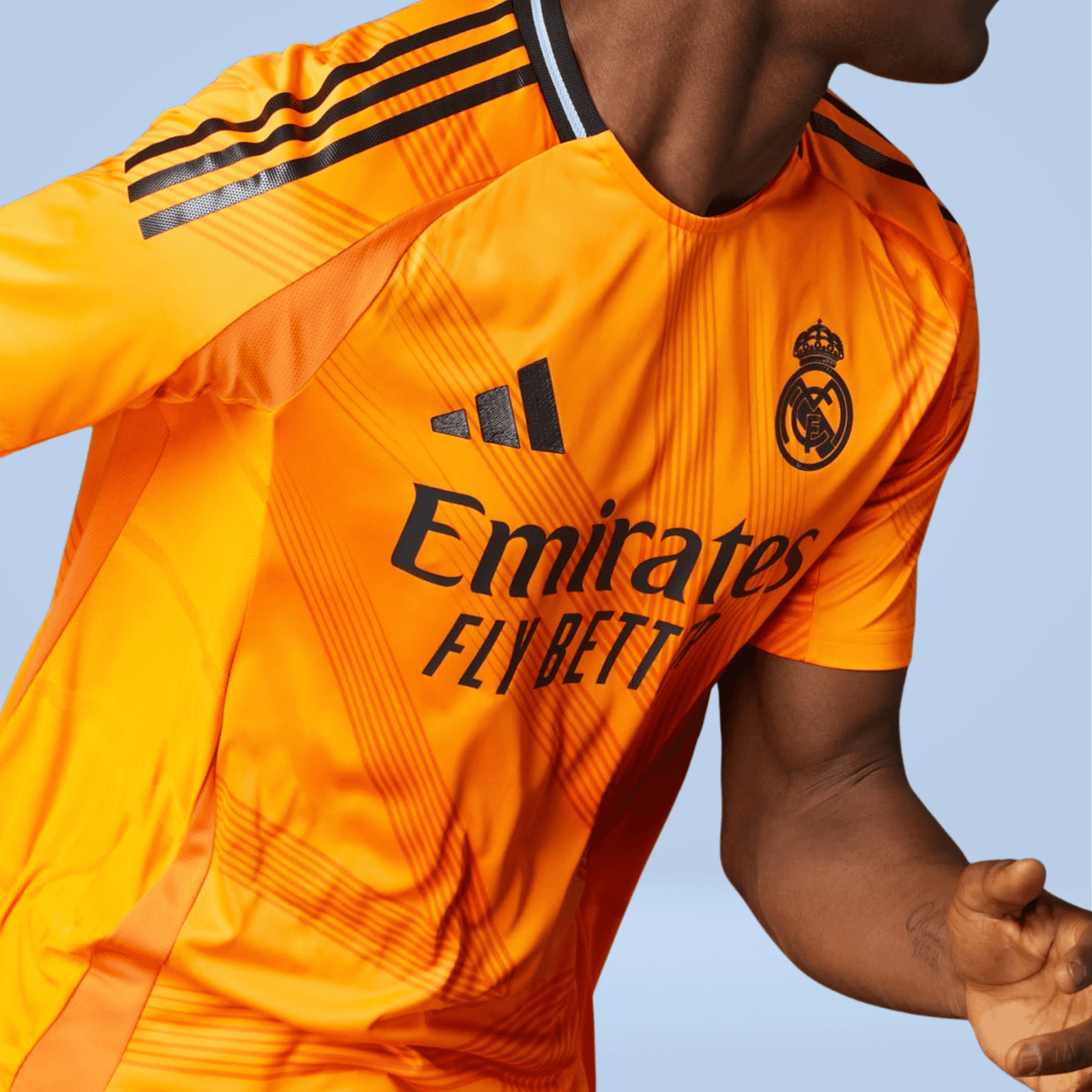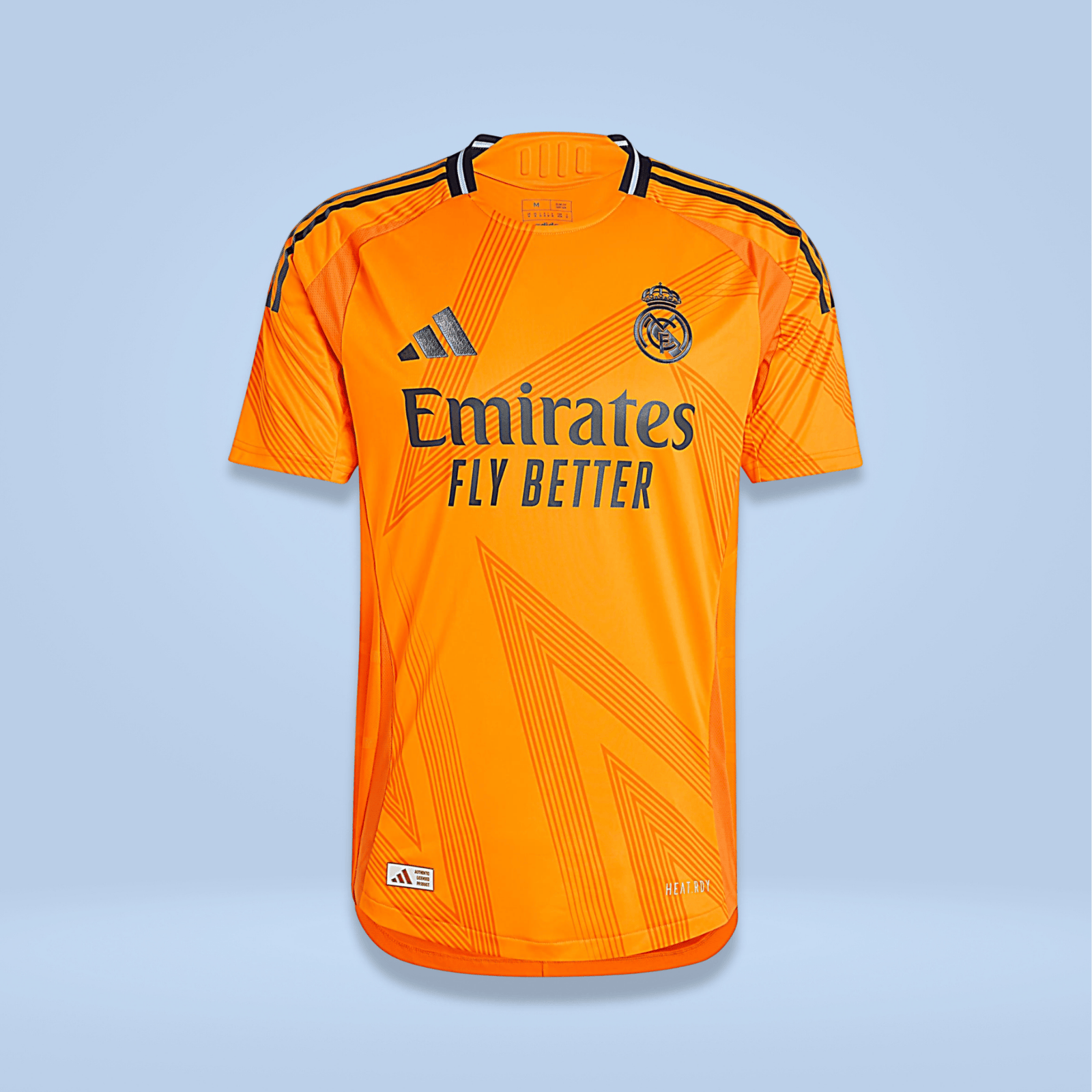 Highlighting the rise of a brand-new football generation. Created to complement Real Madrid’s shimmering skills, this adidas away authentic jersey stands out with a vibrant orange base and an abstract, star-inspired design. Its metallic blue details include a heat-applied club badge. Behind the scenes, performance-boosting HEAT.RDY makes for effervescent play.This product is made with 100% recycled materials. By reusing materials that have already been created, we help to reduce waste and our reliance on finite resources and reduce the footprint of the products we make.